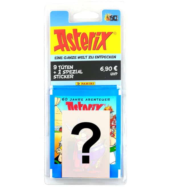 Blister de 9 saquetas (=45 cromos) + 1 adesivo especial da coleção de cromos "Panini Asterix 60 Anos de Aventuras".