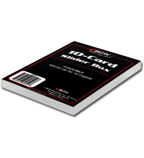 A "BCW 10-Card Slider Box" pode conter 10 cards padrão. Design "snap top". Dimensões exteriores: 3 5/8 x 2 3/4 x 3/8. Dimensões internas: 3 1/2 X 2 1/2 x 1/8.