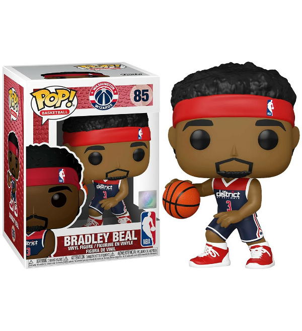 Funko POP! "Basketball 85 NBA - Bradley Beal Washington Wizards". A figura de vinil tem aproximadamente 9 cm de altura e vem em uma caixa de janela.