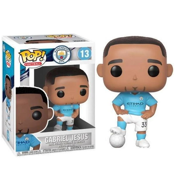 Funko POP! "Football 13 - Gabriel Jesus Manchester City". A figura de vinil tem aproximadamente 9 cm de altura e vem em uma caixa de janela.