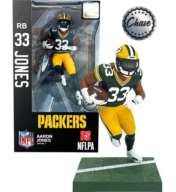 Figura esportiva da Imports Dragon NFL Series 1 "Aaron Jones (Green Bay Packers) CHASE Edition". A figura tem aproximadamente 15 cm de altura e é feita de plástico.