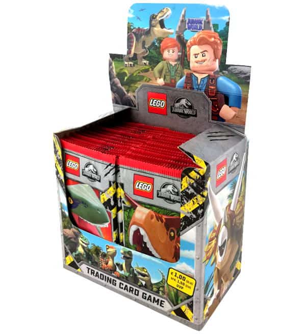 Caixa com 50 saquetas da Lego Jurassic World Trading Card Game. Cada saqueta contém 5 cards.