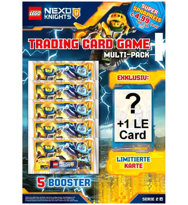 Multipack de 5 saquetas (=25 cards) da coleção LEGO Nexo Knights Trading Cards Série 2. Cada Multipack também contém 1 Limited Edition Card extra.