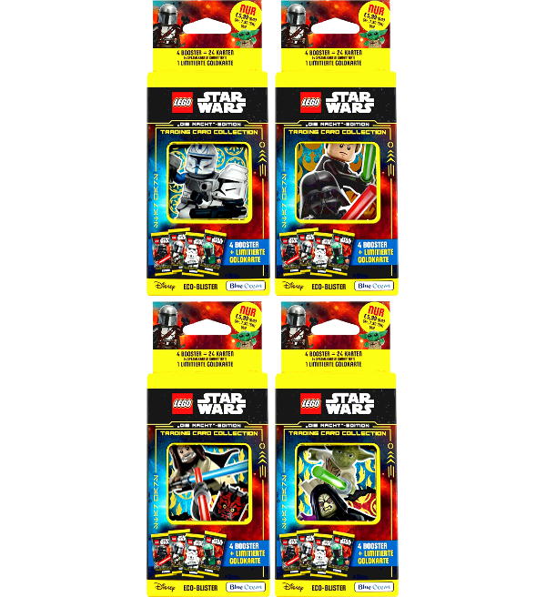 Todos os 4 Blister da Star Wars Serie 4 "Die Macht" diferentes. No total, você recebe 16 saquetas (=96 cartas) mais essas 4 cartas limitadas diferentes.