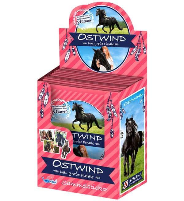 Caixa de 36 saquetas da coleção de cromos "Ostwind Das grosse Finale". Cada saqueta contém 5 cromos.