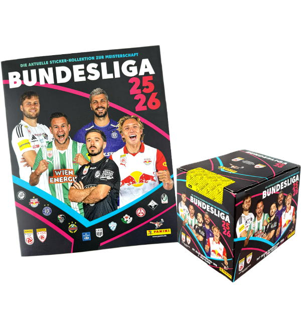 Álbum + 1 caixa (=50 saquetas) da coleção de cromos "Panini Bundesliga Áustria 2025-26". Cada saqueta contém 6 cromos.