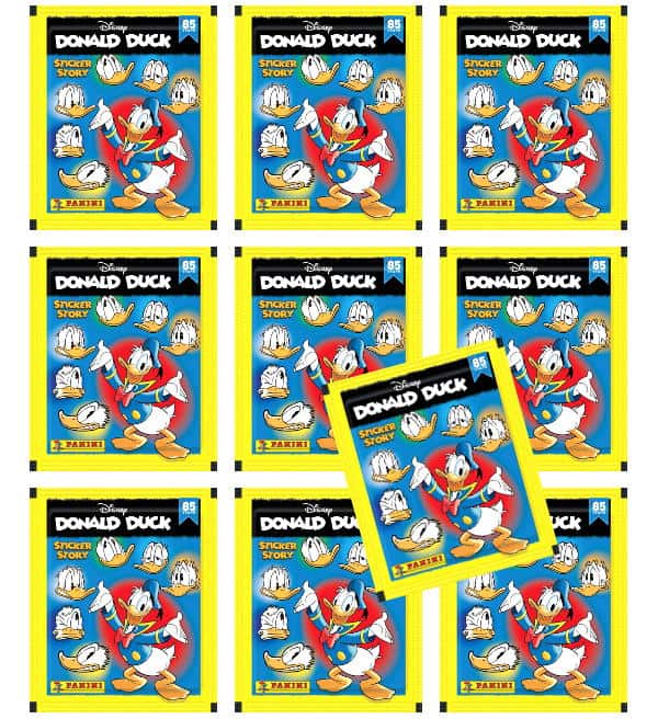 10 saquetas da coleção de cromos e cards Panini Donald Duck 85 Anos. Cada saqueta contém 5 cromos + 1 cartão.