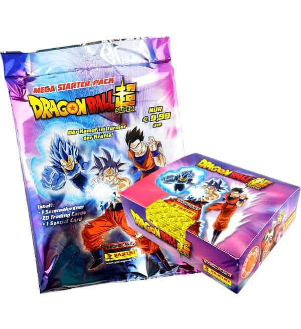 Starter Pack + caixa de 24 saquetas da coleção Panini Dragon Ball Super Trading Cards com o seguinte conteúdo:
