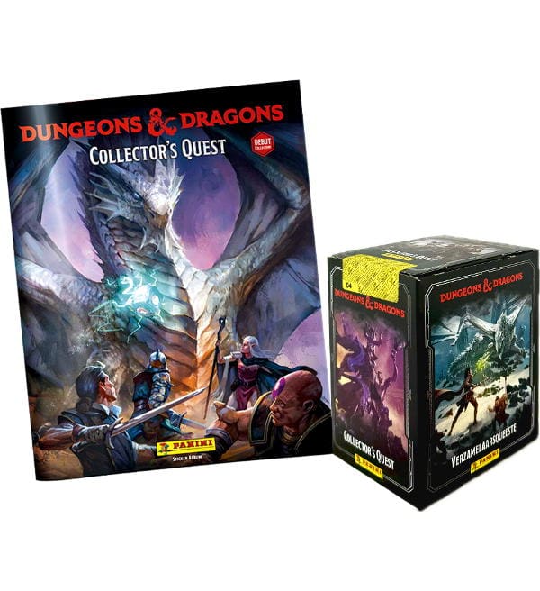 Álbum (versão alemã) + 1 Caixa (=36 saquetas) da coleção de cromos & cards "Panini Dungeons & Dragons Collector's Quest". Cada saqueta contém 4 cromos + 1 Trading Card.