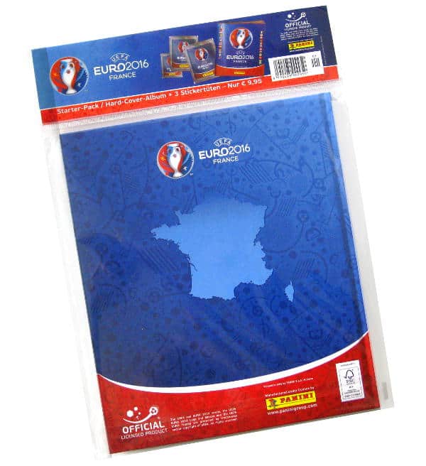 O novo álbum de autocolantes Panini EURO 2016 é uma edição de luxo de capa dura. É fornecido num conjunto inicial que inclui 3 pacotes de autocolantes.
