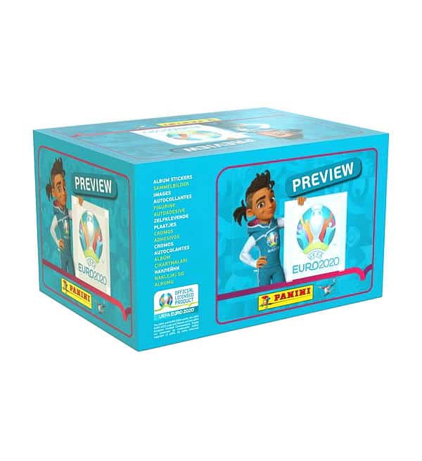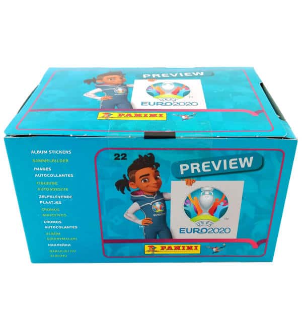 Caixa de 120 saquetas da coleção de cromos Panini EURO 2020 Preview. Cada saqueta contém 5 adesivos, o que perfaz um número total de 600 cromos por caixa.