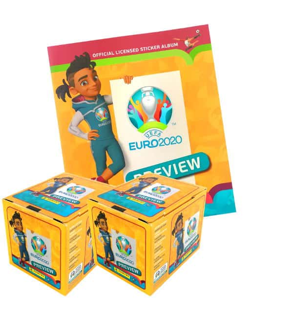 1 álbum + 2 caixas de 60 saquetas cada (versão internacional) da coleção de cromos Panini EURO 2020 Preview. Cada saqueta contém 5 adesivos, o que perfaz um número total de 600 cromos.