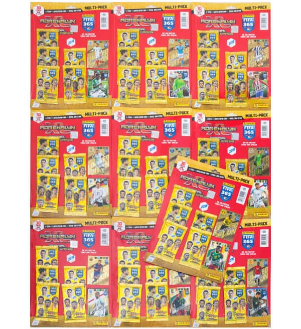Todos os 10 diferentes blisters Panini FIFA 365 2018 Adrenalyn XL. No total, você recebe 50 boosters (= 300 cartas) mais 10 Cartas Especiais mais todas essas 10 Cartas de Edição Limitada: