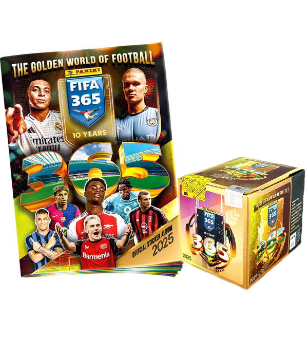 Álbum + caixa de 50 saquetas da coleção de cromos "Panini FIFA 365 2025". Cada saqueta contém 5 cromos.