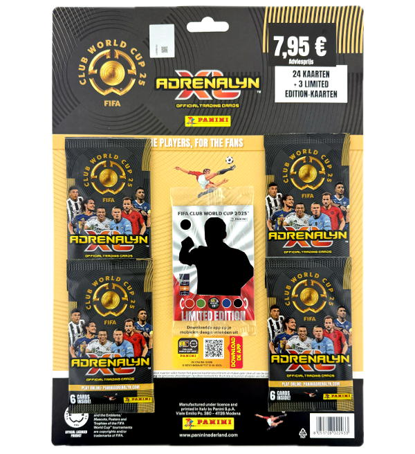 Multipack da coleção de "Panini FIFA Club World Cup 2025 Adrenalyn XL" Trading Cards com o seguinte conteúdo: