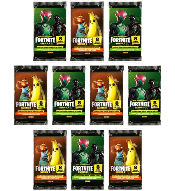 10 saquetas da coleção Panini Fortnite Series 2 Trading Cards. Cada saqueta contém 8 cards.