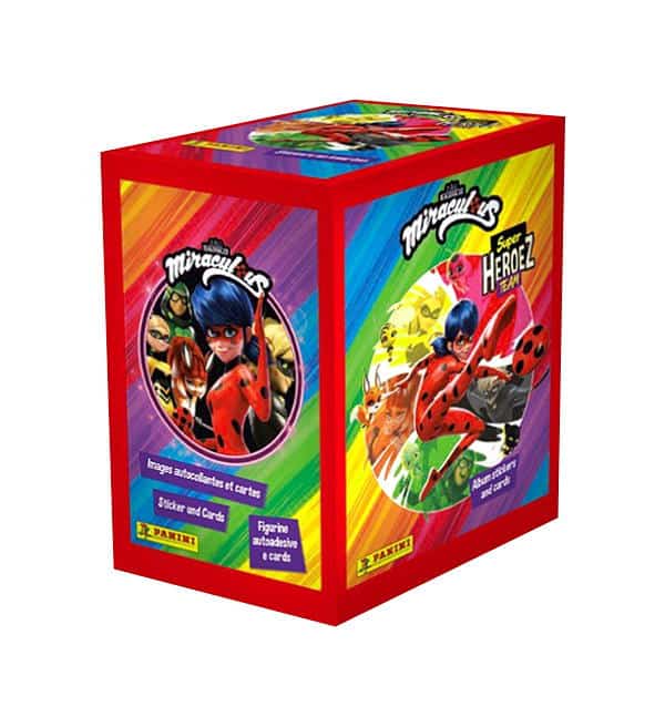 Caixa de 50 saquetas da coleção de cromos e cards Panini Miraculous "Super Heroez Team". Cada saqueta contém 4 cromos + 1 cartão.