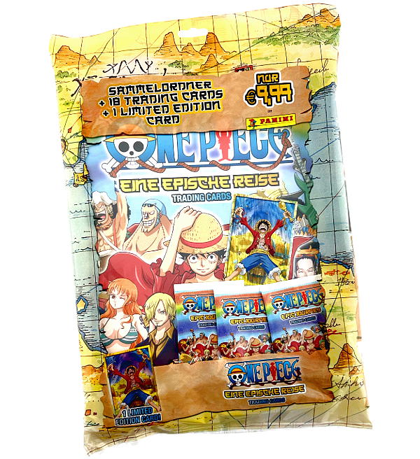 Starter-Pack da coleção de "Panini One Piece - Epic Journey" Trading Cards (2023) com o seguinte conteúdo: