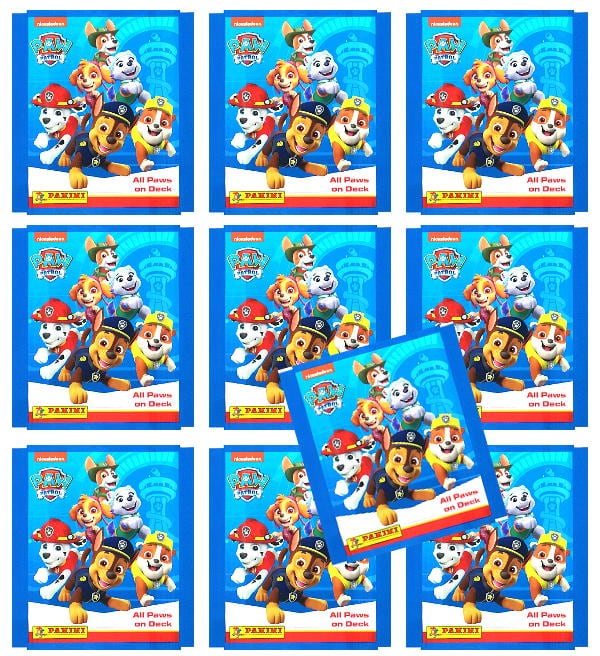 10 saquetas da coleção de cromos "Panini Paw Patrol All Paws on Deck" (2022). Cada saqueta contém 5 cromos.