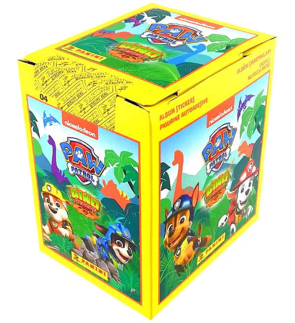 Caixa de 36 saquetas da coleção de cromos "Panini Paw Patrol Dino Rescue". Cada saqueta contém 5 cromos.