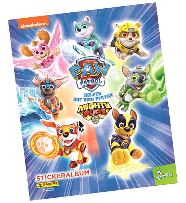 Caderneta vazia (versão alemã) para a coleção de cromos "Panini Paw Patrol Mighty Pups" com 32 páginas e espaço para 176 cromos.
