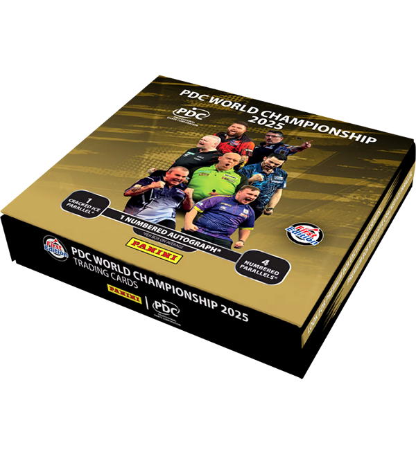 Premium Box de 10 saquetas da coleção de "Panini PDC World Championship 2025" Trading Cards. Cada saqueta contém 8 cards, o que perfaz um número total de 80 cards por caixa.