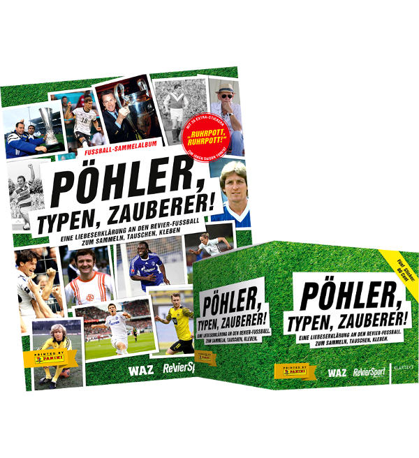 Álbum + caixa de 50 saquetas da coleção de cromos "Panini Pöhler, Typen, Zauberer!". Cada saqueta contém 5 cromos.