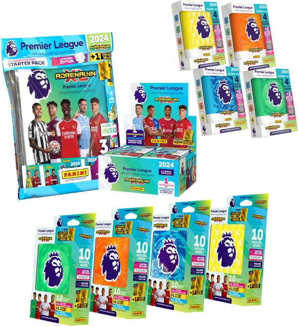 Mega-Bundle da coleção de "Panini Premier League 2024 Adrenalyn XL" Trading Cards com o seguinte conteúdo: