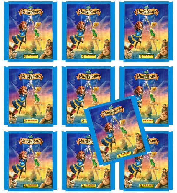 10 saquetas da coleção de cromos "Panini Sininho Fadas E Piratas". Cada saqueta contém 5 cromos.