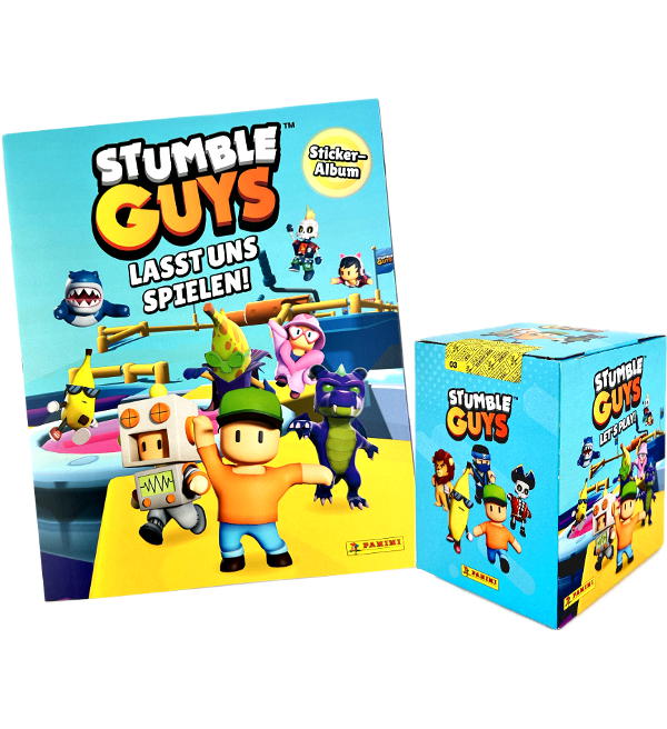 Álbum (versão alemã) + caixa de 36 saquetas da coleção de cromos "Panini Stumble Guys Let's Play". Cada saqueta contém 5 cromos.