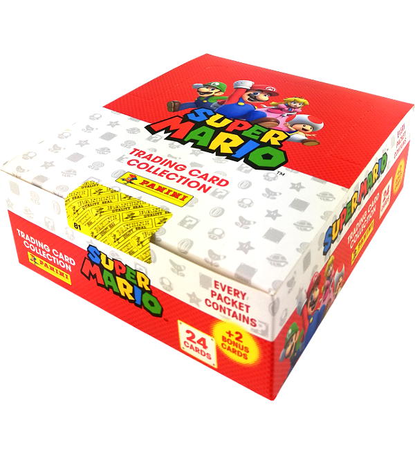 Caixa de 10 Fatpacks da coleção Panini Super Mario Trading Cards 2022. Cada saqueta Fat Pack contém 24 cards + 2 Bonus Cards.