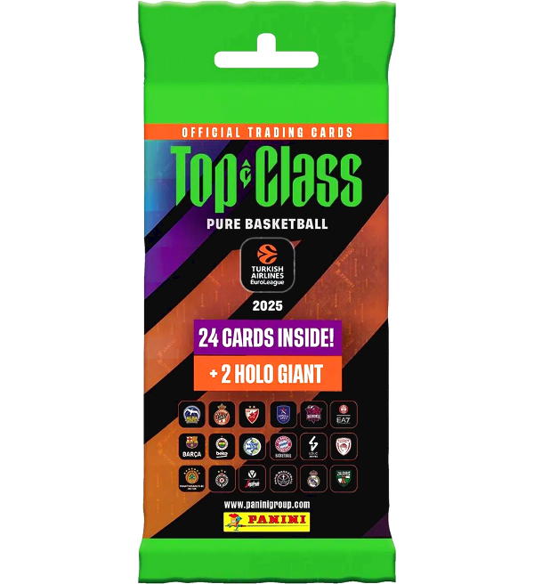 Fatpack da coleção de "Panini Turkish Airlines EuroLeague Top Class 2025" Trading Cards. Cada saqueta Fatpack 24 cards + 2 Holo Giants.