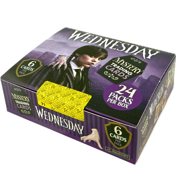 Caixa de 24 saquetas da coleção de "Panini Wednesday Mystery" Trading Cards. Cada saqueta contém 6 cards, o que perfaz um número total de 144 cards por caixa.