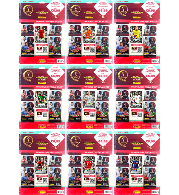 9 Multipacks diferentes da coleção Panini World Cup 2022 Adrenalyn XL Trading Cards. No total, você recebe 36 saquetas (=288 cards) mais estes 9 Limited Edition Cards: