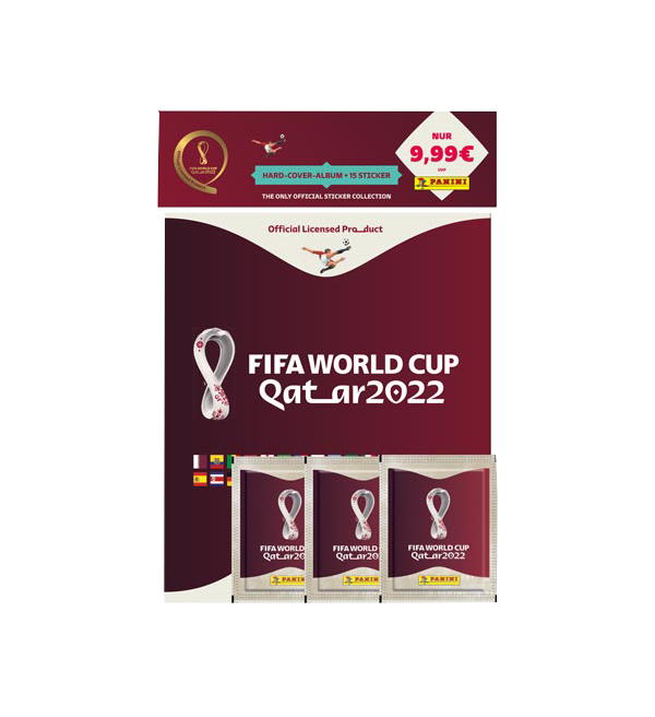 Hardcover Starter Pack com 3 saquetas da coleção de cromos Panini Copa do Mundo 2022 Qatar. Cada saqueta contém 5 adesivos.