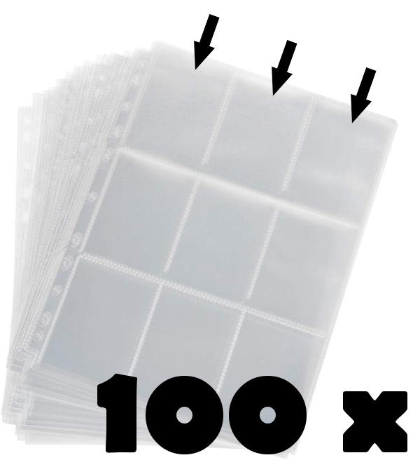 100 "9-Pocket Pages Top Loading" de alta qualidade com 11 furos para armazenamento seguro de seus cards. As "9-Pocket Pages" são adequadas para todas as cartas padrão, como Pokémon, Yu-Gi-Oh, Magic etc.