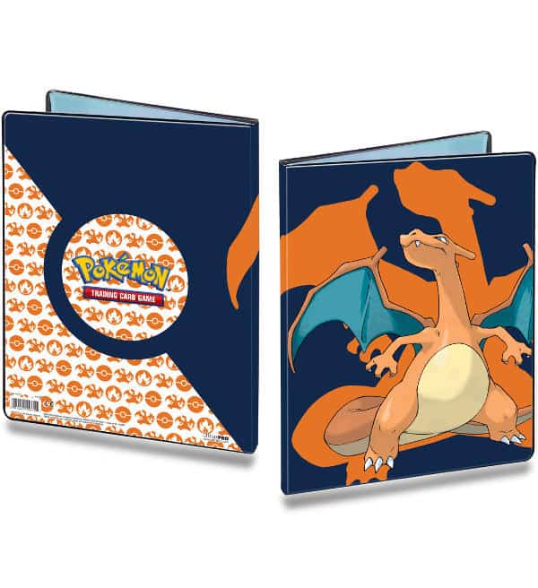 Arquivador Pokemon A4 da Ultra Pro "Charizard 2020"" com 10 páginas para 9 cartões cada. O portfólio oferece espaço para 90 cartões com alocação de um lado ou 180 cartões com alocação de dois lados.