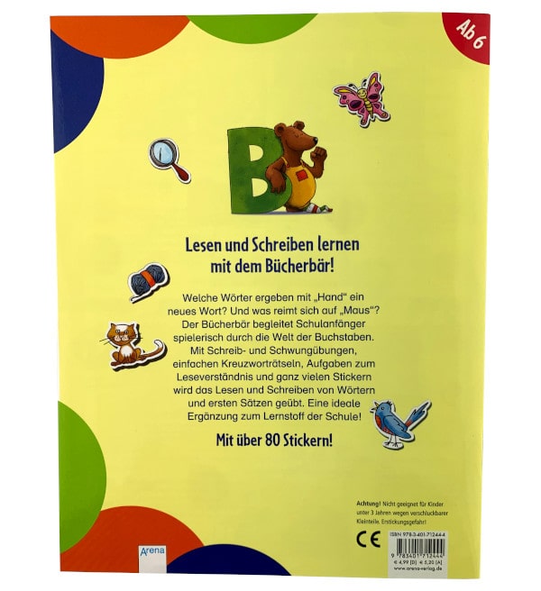 Aprenda a ler e a escrever com o urso do livro! Que palavras fazem uma nova palavra com "mão"? E o que rima com "rato"? O urso-livro acompanha os principiantes da escola de forma lúdica através do mundo das letras. Com exercícios de escrita e balanço, simples palavras cruzadas, tarefas de compreensão de leitura e muitos autocolantes, a leitura e escrita de palavras e primeiras frases é praticada. Um suplemento ideal para o material de aprendizagem na escola. Com mais de 80 autocolantes.