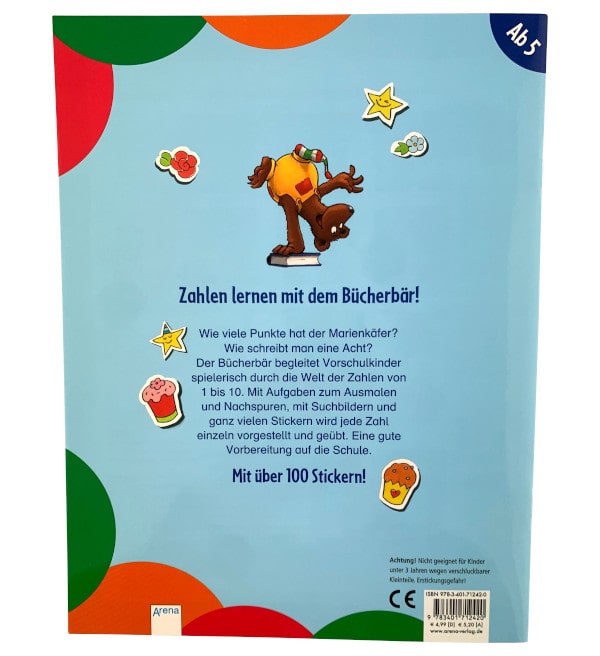 Aprendizagem de números com o urso do livro! Quantos pontos tem a joaninha? Como é que se escreve um oito? O urso de livro acompanha as crianças em idade pré-escolar brincando pelo mundo dos números de 1 a 10. Com tarefas para colorir e traçar, com imagens de busca e muitos autocolantes, cada número é introduzido e praticado individualmente. Uma boa preparação para a escola. Com mais de 100 autocolantes.