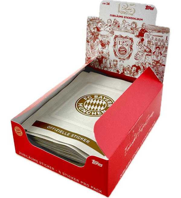 Álbum + 2 caixas (=60 saquetas) da coleção de cromos "Topps 125 Años FC Bayern München". Cada saqueta contém 5 cromos.