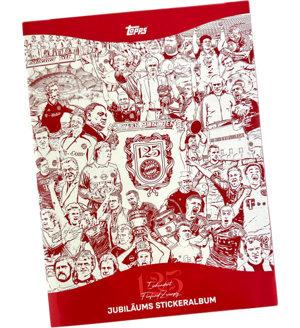 Álbum da coleção de cromos "Topps 125 Años FC Bayern München" com 48 páginas e 6 cromos grátis. É possível recolher um total de 250 cromos.