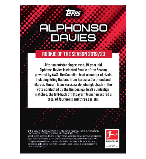 1 "Topps Alphonso Davies Rookie of the Season 2019/20 Autograph / Memorabilia Card" com um autógrafo original + uma peça incorporada de uma camisola orignal. Existem apenas 550 destes cartões em todo o mundo, pelo que cada um tem um número único. O cartão vem num "BCW Card Holder" de alta qualidade e robusto.