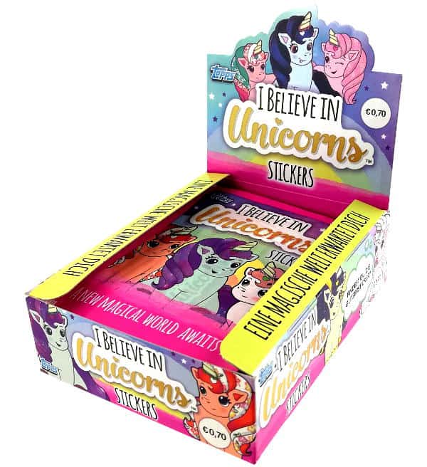 Caixa de 30 saquetas da coleção de cromos "Topps I believe in Unicorns". Cada saqueta contém 5 cromos.