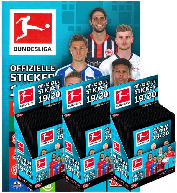Caderneta vazia + 3 caixas (=540 cromos) para a coleção de cromos Topps Bundesliga 2019/2020.