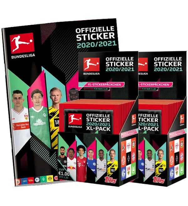 Album + 2 caixas (=72 saquetas) da coleção de cromos Topps Bundesliga 2020/2021. Cada saqueta contém 10 cromos.