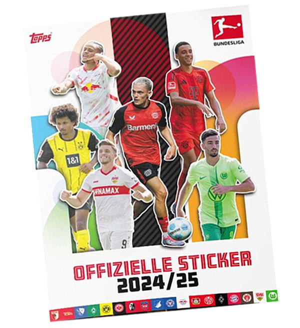 Álbum da coleção de cromos Topps Bundesliga 2024/2025 com 88 páginas e 6 autocolantes gratuitos.