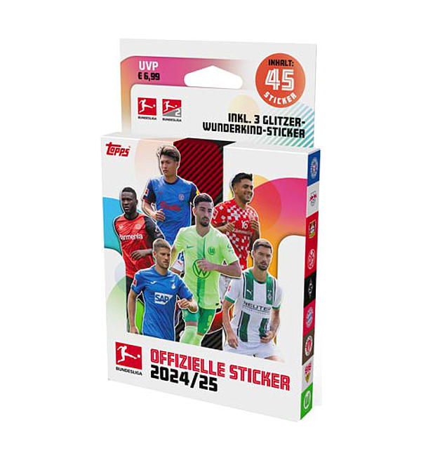 Eco-Blister (=6 saquetas + 3 Wunderkind-Sticker) da coleção de cromos Topps Bundesliga 2024/2025. Cada saqueta contém 7 cromos.