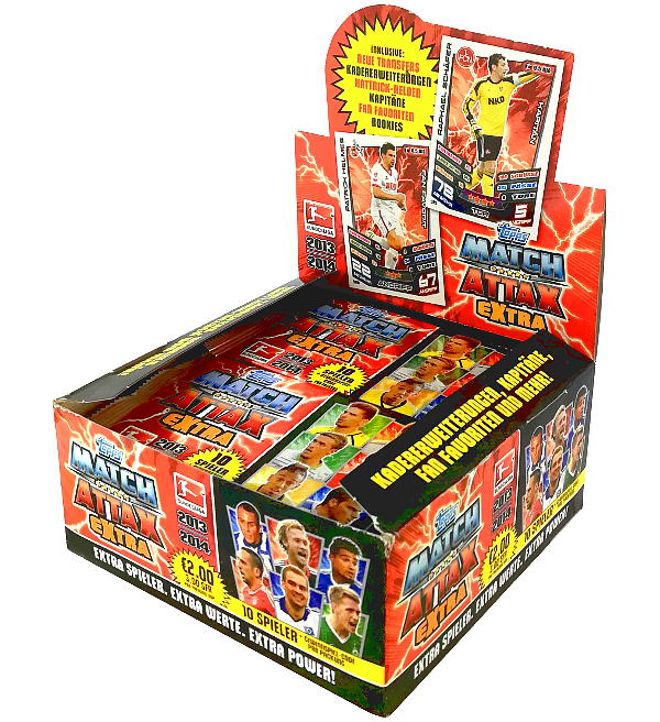 Caixa de 24 saquetas (=240 cartas) para a coleção de "Topps Bundesliga Match Attax EXTRA 2013/14" Trading Cards. Cada saqueta contém 10 cards.