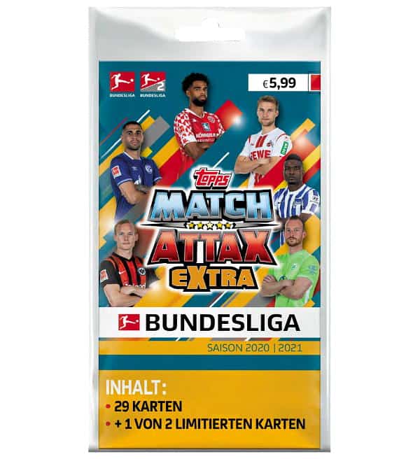 Blister da colecção "Topps Bundesliga Match Attax EXTRA 2020/21" com 29 cartões + 1 Limited Edition Cards.