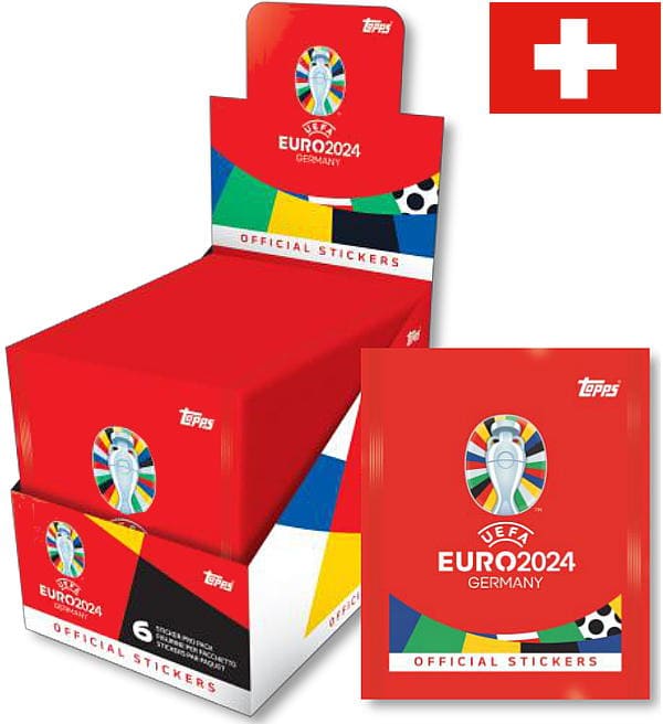 Caixa (SWISS EDITION) de 100 saquetas da coleção de cromos "Topps EURO 2024". Cada saqueta contém 6 sticker.